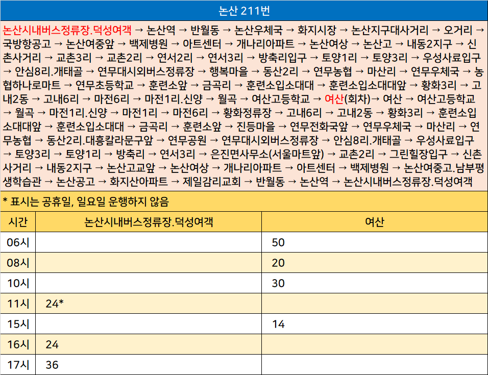 논산 211번: 논산시내버스정류장.덕성여객 → 논산역 → 반월동 → 논산우체국 → 화지시장 → 논산지구대사거리 → 오거리 → 국방항공고 → 논산여중앞 → 백제병원 → 아트센터 → 개나리아파트 → 논산여상 → 논산고 → 내동2지구 → 신촌사거리 → 교촌3리 → 교촌2리 → 연서2리 → 연서3리 → 방축리입구 → 토양1리 → 토양3리 → 우성사료입구 → 안심8리.개태골 → 연무대시외버스정류장 → 행복마을 → 동산2리 → 연무농협 → 마산리 → 연무우체국 → 농협하나로마트 → 연무초등학교 → 훈련소앞 → 금곡리 → 훈련소입소대대 → 훈련소입소대대앞 → 황화3리 → 고내2동 → 고내6리 → 마전6리 → 마전1리.신양 → 월곡 → 여산고등학교 → 여산(회차)→ 여산 → 여산고등학교 → 월곡 → 마전1리.신양 → 마전1리 → 마전6리 → 황화정류장 → 고내6리 → 고내2동 → 황화3리 → 훈련소입소대대앞 → 훈련소입소대대 → 금곡리 → 훈련소앞 → 진등마을 → 연무전화국앞 → 연무우체국 → 마산리 → 연무농협 → 동산2리.대흥칼라문구앞 → 연무공원 → 연무대시외버스정류장 → 안심8리.개태골 → 우성사료입구 → 토양3리 → 토양1리 → 방축리 → 연서3리 → 은진면사무소(서울마트앞) → 교촌2리 → 그린힐장입구 → 신촌사거리 → 내동2지구 → 논산고교앞 → 논산여상 → 개나리아파트 → 아트센터 → 백제병원 → 논산여중고.남부평생학습관 → 논산공고 → 화지산아파트 → 제일감리교회 → 반월동 → 논산역 → 논산시내버스정류장.덕성여객