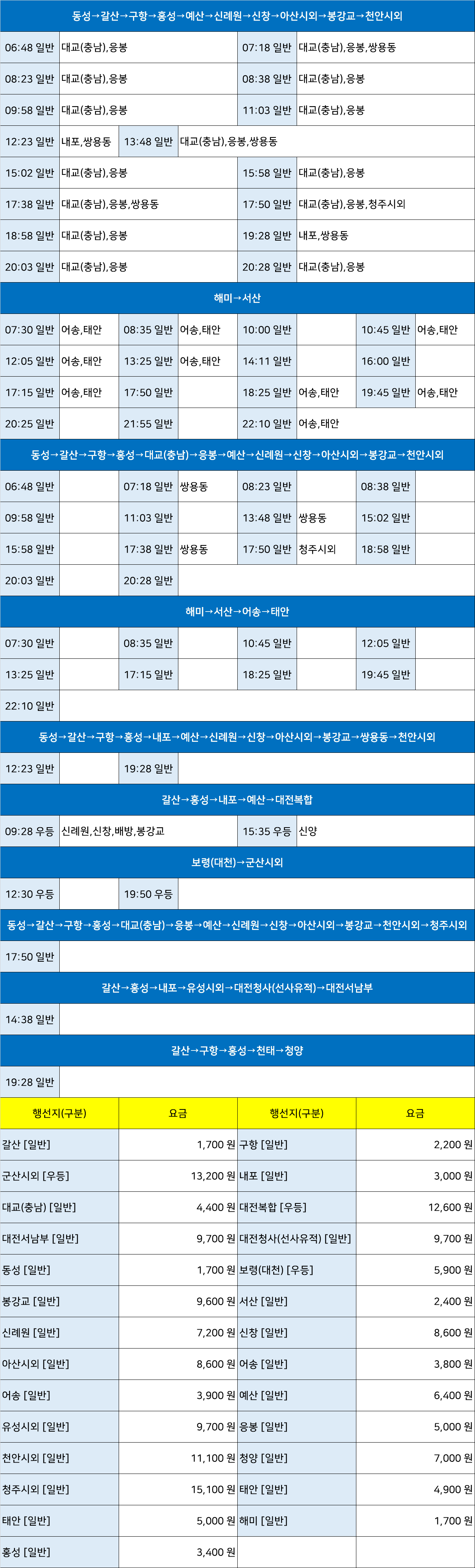 고북시외고속버스정류소 고북정류장 고북터미널 → "갈산→구항→홍성→천태→청양,갈산→홍성→내포→예산→대전,갈산→홍성→내포→유성시외→대전청사(선사유적)→대전서남부,동성→갈산→구항→홍성→내포→예산→신례원→신창→아산시외→봉강교→쌍용동→천안시외,동성→갈산→구항→홍성→대교(충남)→응봉→예산→신례원→신창→아산시외→봉강교→천안시외→청주시외,동성→갈산→구항→홍성→예산→신례원→신창→아산시외→봉강교→천안시외,배방,보령(대천)→군산시외,신양,해미→서산→어송→태안".