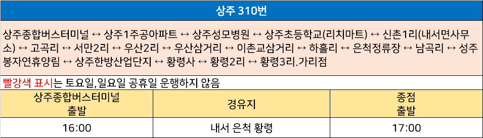 상주 310번: 상주종합버스터미널 ↔ 상주1주공아파트 ↔ 상주성모병원 ↔ 상주초등학교(리치마트) ↔ 신촌1리(내서면사무소) ↔ 고곡리 ↔ 서만2리 ↔ 우산2리 ↔ 우산삼거리 ↔ 이촌교삼거리 ↔ 하흘리 ↔ 은척정류장 ↔ 남곡리 ↔ 성주봉자연휴양림 ↔ 상주한방산업단지 ↔ 황령사 ↔ 황령2리 ↔ 황령3리.가리점