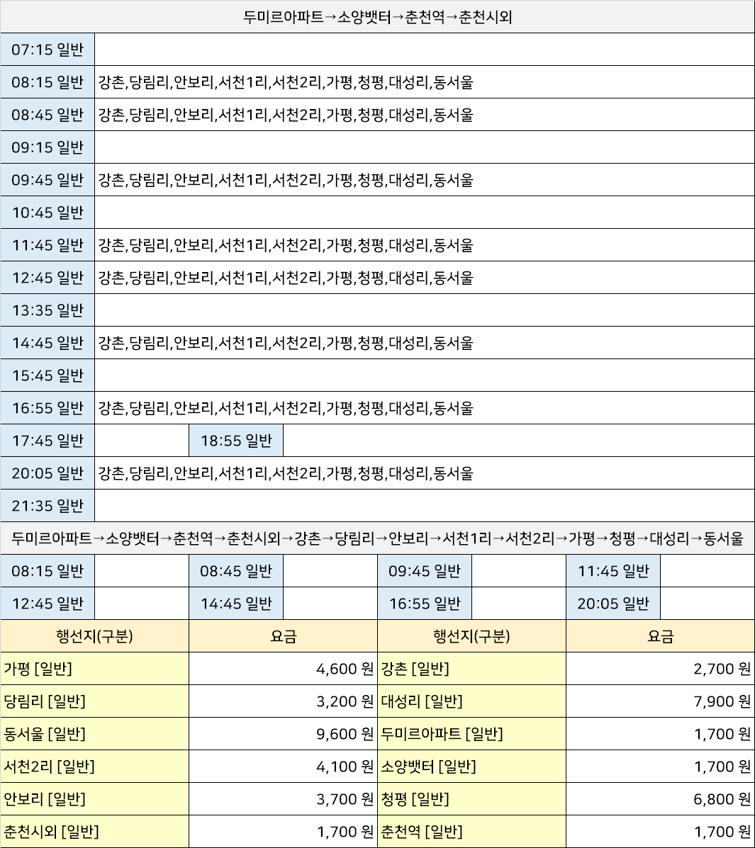 춘천현대아파트시외고속버스터미널 춘천현대아파트정류장 춘천현대아파트정류소 우두로입구정류장 → "두미르아파트→소양뱃터→춘천역→춘천시외→강촌→당림리→안보리→서천1리→서천2리→가평→청평→대성리→동서울".