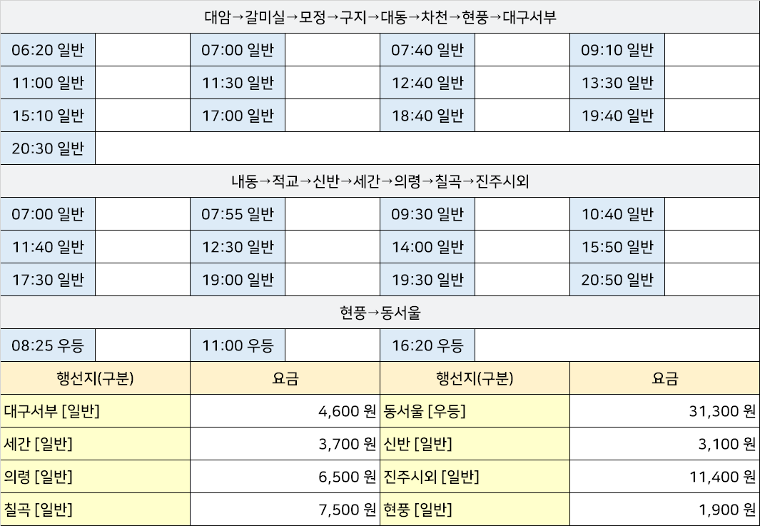 이방시외고속버스터미널 이방정류장 이방정류소 → "내동→적교→신반→세간→의령→칠곡→진주시외,대암→갈미실→모정→구지→대동→차천→현풍→대구서부,현풍→동서울".