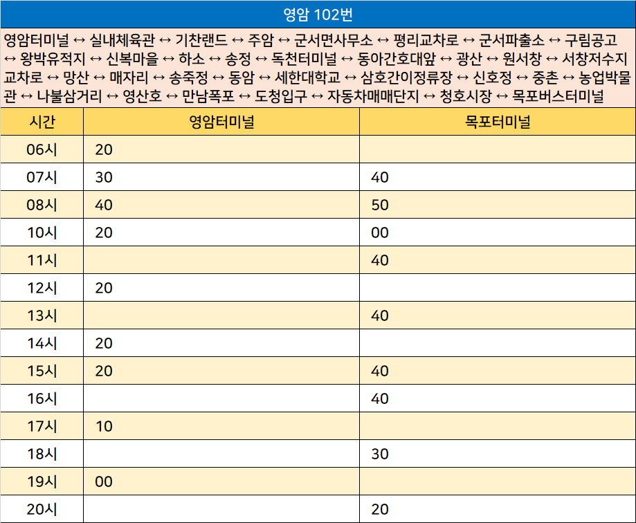 영암 102번: 영암터미널 ↔ 실내체육관 ↔ 기찬랜드 ↔ 주암 ↔ 군서면사무소 ↔ 평리교차로 ↔ 군서파출소 ↔ 구림공고 ↔ 왕박유적지 ↔ 신복마을 ↔ 하소 ↔ 송정 ↔ 독천터미널 ↔ 동아간호대앞 ↔ 광산 ↔ 원서창 ↔ 서창저수지교차로 ↔ 망산 ↔ 매자리 ↔ 송죽정 ↔ 동암 ↔ 세한대학교 ↔ 삼호간이정류장 ↔ 신호정 ↔ 중촌 ↔ 농업박물관 ↔ 나불삼거리 ↔ 영산호 ↔ 만남폭포 ↔ 도청입구 ↔ 자동차매매단지 ↔ 청호시장 ↔ 목포버스터미널