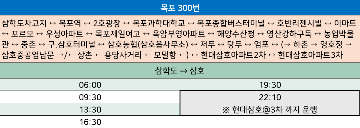 목포 300번: 삼학도차고지 ↔ 목포역 ↔ 2호광장 ↔ 목포과학대학교 ↔ 목포종합버스터미널 ↔ 호반리젠시빌 ↔ 이마트 ↔ 포르모 ↔ 우성아파트 ↔ 목포제일여고 ↔ 옥암부영아파트 ↔ 해양수산청 ↔ 영산강하구둑 ↔ 농업박물관 ↔ 중촌 ↔ 구.삼호터미널 ↔ 삼호농협(삼호읍사무소) ↔ 저두 ↔ 당두 ↔ 엄포 ↔ (→ 하촌 → 영호정 → 삼호중공업남문 →/← 상촌 ← 용당사거리 ← 모밀항 ←) ↔ 현대삼호아파트2차 ↔ 현대삼호아파트3차