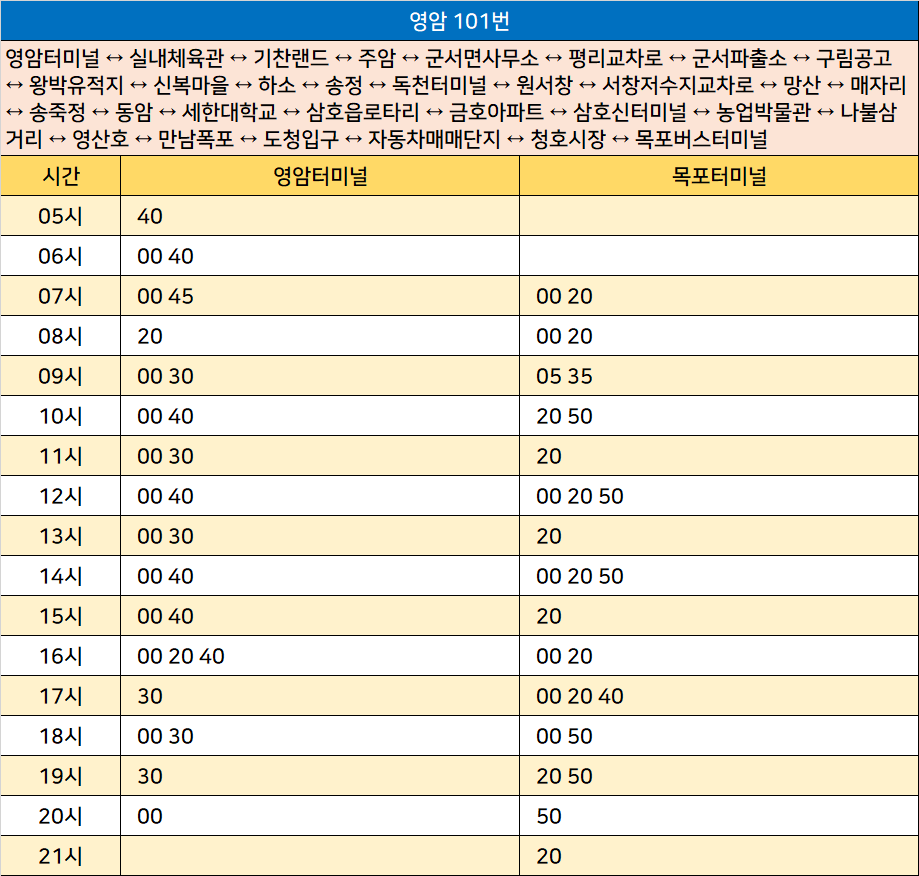 영암 101번: 영암터미널 ↔ 실내체육관 ↔ 기찬랜드 ↔ 주암 ↔ 군서면사무소 ↔ 평리교차로 ↔ 군서파출소 ↔ 구림공고 ↔ 왕박유적지 ↔ 신복마을 ↔ 하소 ↔ 송정 ↔ 독천터미널 ↔ 원서창 ↔ 서창저수지교차로 ↔ 망산 ↔ 매자리 ↔ 송죽정 ↔ 동암 ↔ 세한대학교 ↔ 삼호읍로타리 ↔ 금호아파트 ↔ 삼호신터미널 ↔ 농업박물관 ↔ 나불삼거리 ↔ 영산호 ↔ 만남폭포 ↔ 도청입구 ↔ 자동차매매단지 ↔ 청호시장 ↔ 목포버스터미널