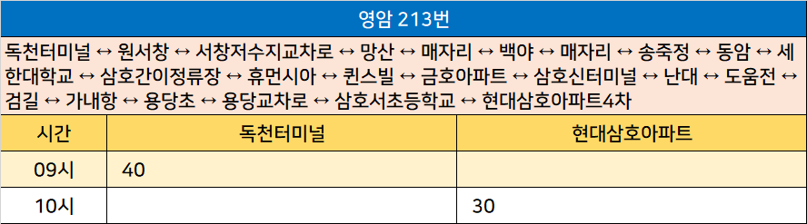 영암 213번: 독천터미널 ↔ 원서창 ↔ 서창저수지교차로 ↔ 망산 ↔ 매자리 ↔ 백야 ↔ 매자리 ↔ 송죽정 ↔ 동암 ↔ 세한대학교 ↔ 삼호간이정류장 ↔ 휴먼시아 ↔ 퀸스빌 ↔ 금호아파트 ↔ 삼호신터미널 ↔ 난대 ↔ 도움전 ↔ 검길 ↔ 가내항 ↔ 용당초 ↔ 용당교차로 ↔ 삼호서초등학교 ↔ 현대삼호아파트4차