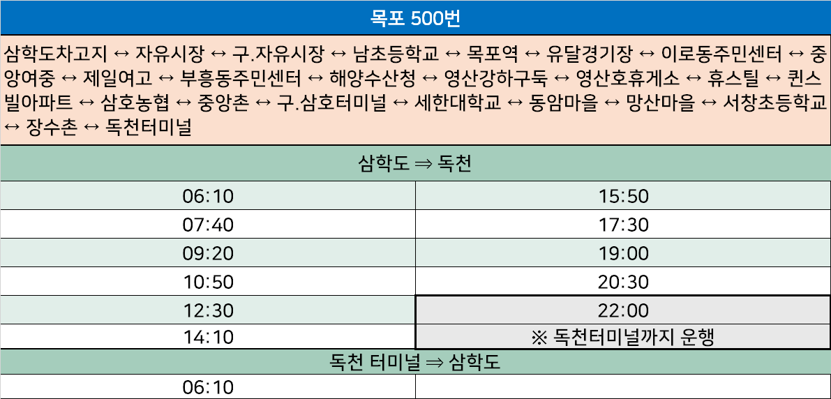 목포 500번: 삼학도차고지 ↔ 자유시장 ↔ 구.자유시장 ↔ 남초등학교 ↔ 목포역 ↔ 유달경기장 ↔ 이로동주민센터 ↔ 중앙여중 ↔ 제일여고 ↔ 부흥동주민센터 ↔ 해양수산청 ↔ 영산강하구둑 ↔ 영산호휴게소 ↔ 휴스틸 ↔ 퀸스빌아파트 ↔ 삼호농협 ↔ 중앙촌 ↔ 구.삼호터미널 ↔ 세한대학교 ↔ 동암마을 ↔ 망산마을 ↔ 서창초등학교 ↔ 장수촌 ↔ 독천터미널