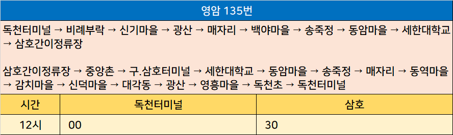 영암 135번: 독천터미널 → 비례부락 → 신기마을 → 광산 → 매자리 → 백야마을 → 송죽정 → 동암마을 → 세한대학교 → 삼호간이정류장 / 삼호간이정류장 → 중앙촌 → 구.삼호터미널 → 세한대학교 → 동암마을 → 송죽정 → 매자리 → 동역마을 → 감치마을 → 신덕마을 → 대각동 → 광산 → 영흥마을 → 독천초 → 독천터미널