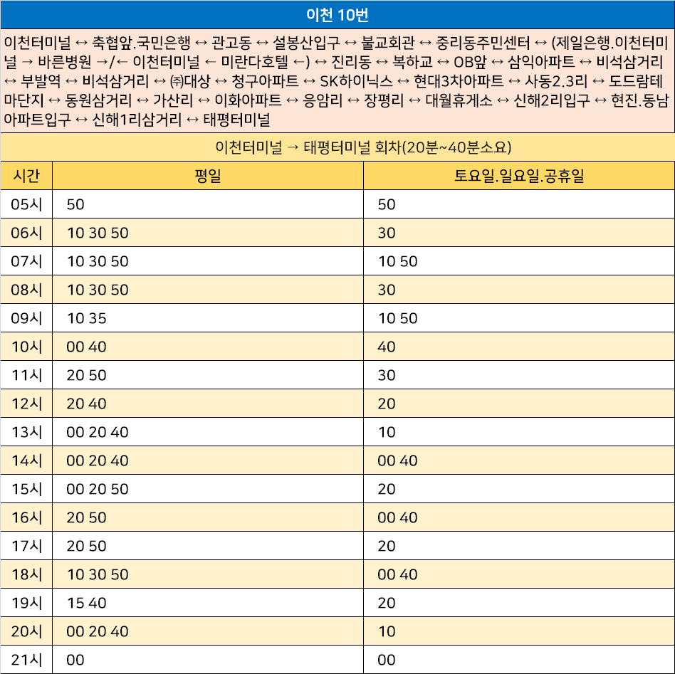 이천 10번: 이천터미널 ↔ 축협앞.국민은행 ↔ 관고동 ↔ 설봉산입구 ↔ 불교회관 ↔ 중리동주민센터 ↔ (제일은행.이천터미널 → 바른병원 →/← 이천터미널 ← 미란다호텔 ←) ↔ 진리동 ↔ 복하교 ↔ OB앞 ↔ 삼익아파트 ↔ 비석삼거리 ↔ 부발역 ↔ 비석삼거리 ↔ ㈜대상 ↔ 청구아파트 ↔ SK하이닉스 ↔ 현대3차아파트 ↔ 사동2.3리 ↔ 도드람테마단지 ↔ 동원삼거리 ↔ 가산리 ↔ 이화아파트 ↔ 응암리 ↔ 장평리 ↔ 대월휴게소 ↔ 신해2리입구 ↔ 현진.동남아파트입구 ↔ 신해1리삼거리 ↔ 태평터미널