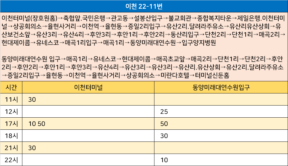 이천 22-11번: 이천터미널(장호원홈)→축협앞.국민은행→관고동→설봉산입구→불교회관→종합복지타운→제일은행.이천터미널→상공회의소→율현사거리→이천역→율현동→증일2리입구→유산2리.달려라주유소→유산리유산상회→유산보건소앞→유산3리→유산4리→후안3리→후안1리→후안2리→동산리입구→단천2리→단천1리→매곡2리→현대제이콤→유네스코→매곡1리입구→매곡1리→동양미래대연수원→입구양지병원 / 동양미래대연수원 입구→매곡1리→유네스코→현대제이콤→매곡초교앞→매곡2리→단천1리→단천2리→후안2리→후안2리→후안1리→후안3리→유산4리→유산3리→유산3리→유산리.유산상회→유산2리.달려라주유소→증일2리입구→율현동→이천역→율현사거리→상공회의소→미란다호텔→터미널신둔홈