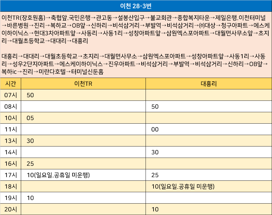 이천 28-3번: 이천TR(장호원홈)→축협앞.국민은행→관고동→설봉산입구→불교회관→종합복지타운→제일은행.이천터미널→바른병원→진리→복하교→OB앞→신하리→비석삼거리→부발역→비석삼거리→㈜대상→청구아파트→에스케이하이닉스→현대3차아파트앞→사동리→사동1리→성창아파트앞→삼원엑스포아파트→대월면사무소앞→초지리→대월초등학교→대대리→대흥리 / 대흥리→대대리→대월초등학교→초지리→대월면사무소→삼원엑스포아파트→성창아파트앞→사동1리→사동리→성우2단지아파트→에스케이하이닉스→진우아파트→비석삼거리→부발역→비석삼거리→신하리→OB앞→복하ic→진리→미란다호텔→터미널신둔홈