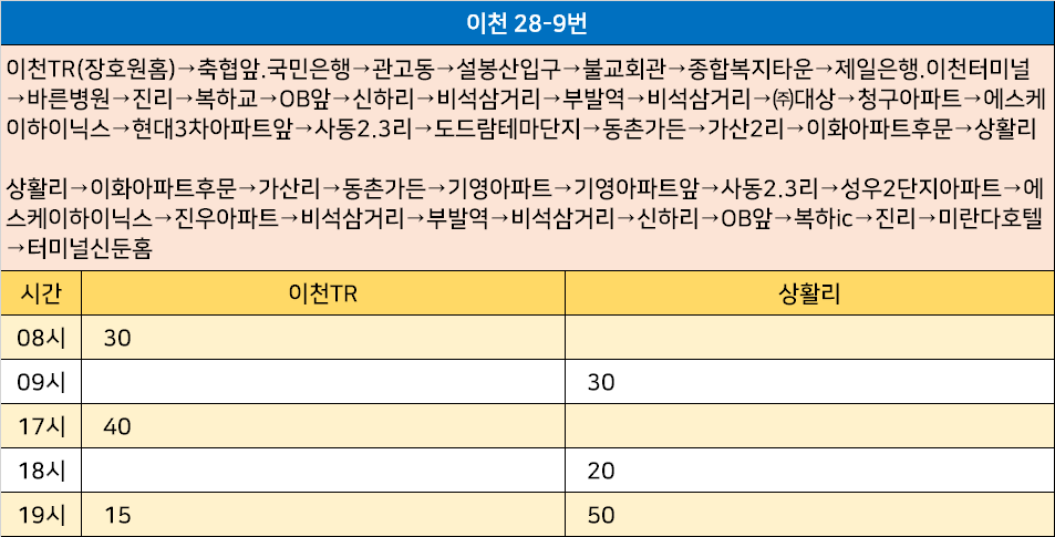 이천 28-9번: 이천TR(장호원홈)→축협앞.국민은행→관고동→설봉산입구→불교회관→종합복지타운→제일은행.이천터미널→바른병원→진리→복하교→OB앞→신하리→비석삼거리→부발역→비석삼거리→㈜대상→청구아파트→에스케이하이닉스→현대3차아파트앞→사동2.3리→도드람테마단지→동촌가든→가산2리→이화아파트후문→상활리 / 상활리→이화아파트후문→가산리→동촌가든→기영아파트→기영아파트앞→사동2.3리→성우2단지아파트→에스케이하이닉스→진우아파트→비석삼거리→부발역→비석삼거리→신하리→OB앞→복하ic→진리→미란다호텔→터미널신둔홈