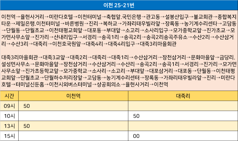이천 25-21번: 이천역→율현사거리→미란다호텔→이천터미널→축협앞.국민은행→관고동→설봉산입구→불교회관→종합복지타운→제일은행.이천터미널→바른병원→진리→복하교→가좌리태우빌라앞→장록동→농기계수리센타→고담동→단월동→단월초교→이천태평교회앞→대포동→부대앞→소고리→소사리입구→모가중학교앞→진가초교→모가면사무소앞→진가리→산내리입구→서경리→송곡1리→송곡2리→송곡2리송곡주유소→수산2리→수산삼거리→수산3리→대죽리→이천호국원앞→대죽4리→대죽4리입구→대죽3리마을회관 / 대죽3리마을회관→대죽3교앞→대죽2리→대죽리→대죽1리→수산삼거리→장천삼거리→문화마을앞→금당리.설성면사무소→문화마을앞→장천삼거리→수산삼거리→수산리→송곡2리→송곡1리→서경리→진가리→모가면사무소앞→진가초등학교앞→모가중학교→소사리→소고리→부대앞→대포삼거리→대포동→단월동→이천태평교회앞→단월초교→단월하수처리장앞→고담동→농기계수리센터→장록동→가좌리태우빌라앞→진리→미란다호텔→터미널신둔홈→이천시외버스터미널→상공회의소→율현사거리→이천역