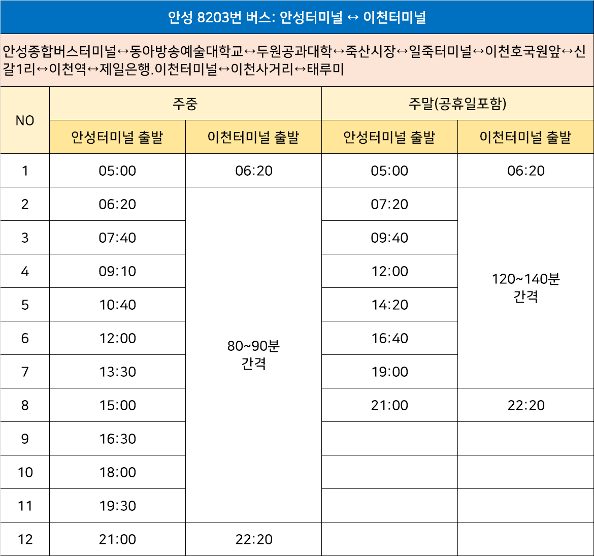 안성종합버스터미널↔동아방송예술대학교↔두원공과대학↔죽산시장↔일죽터미널↔이천호국원앞↔신갈1리↔이천역↔제일은행.이천터미널↔이천사거리↔태루미
