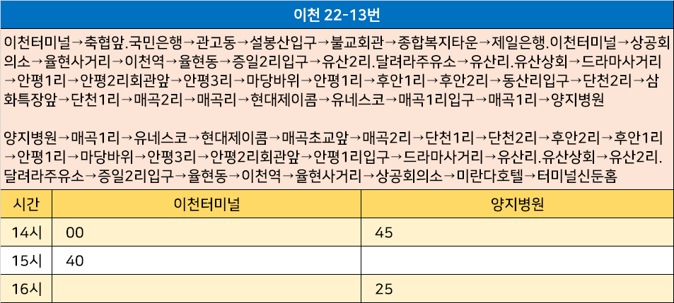 이천 22-13번: 이천터미널→축협앞.국민은행→관고동→설봉산입구→불교회관→종합복지타운→제일은행.이천터미널→상공회의소→율현사거리→이천역→율현동→증일2리입구→유산2리.달려라주유소→유산리.유산상회→드라마사거리→안평1리→안평2리회관앞→안평3리→마당바위→안평1리→후안1리→후안2리→동산리입구→단천2리→삼화특장앞→단천1리→매곡2리→매곡리→현대제이콤→유네스코→매곡1리입구→매곡1리→양지병원 / 양지병원→매곡1리→유네스코→현대제이콤→매곡초교앞→매곡2리→단천1리→단천2리→후안2리→후안1리→안평1리→마당바위→안평3리→안평2리회관앞→안평1리입구→드라마사거리→유산리.유산상회→유산2리.달려라주유소→증일2리입구→율현동→이천역→율현사거리→상공회의소→미란다호텔→터미널신둔홈
