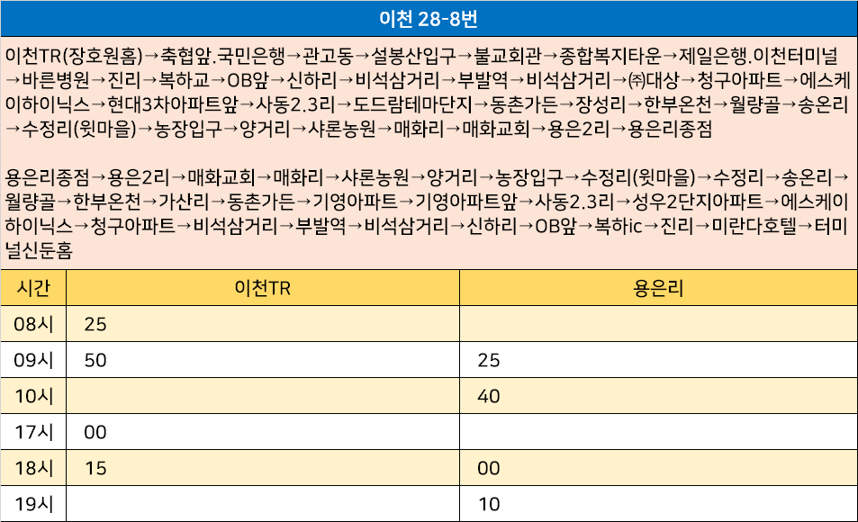 이천 28-8번: 이천TR(장호원홈)→축협앞.국민은행→관고동→설봉산입구→불교회관→종합복지타운→제일은행.이천터미널→바른병원→진리→복하교→OB앞→신하리→비석삼거리→부발역→비석삼거리→㈜대상→청구아파트→에스케이하이닉스→현대3차아파트앞→사동2.3리→도드람테마단지→동촌가든→장성리→한부온천→월량골→송온리→수정리(윗마을)→농장입구→양거리→샤론농원→매화리→매화교회→용은2리→용은리종점 / 용은리종점→용은2리→매화교회→매화리→샤론농원→양거리→농장입구→수정리(윗마을)→수정리→송온리→월량골→한부온천→가산리→동촌가든→기영아파트→기영아파트앞→사동2.3리→성우2단지아파트→에스케이하이닉스→청구아파트→비석삼거리→부발역→비석삼거리→신하리→OB앞→복하ic→진리→미란다호텔→터미널신둔홈