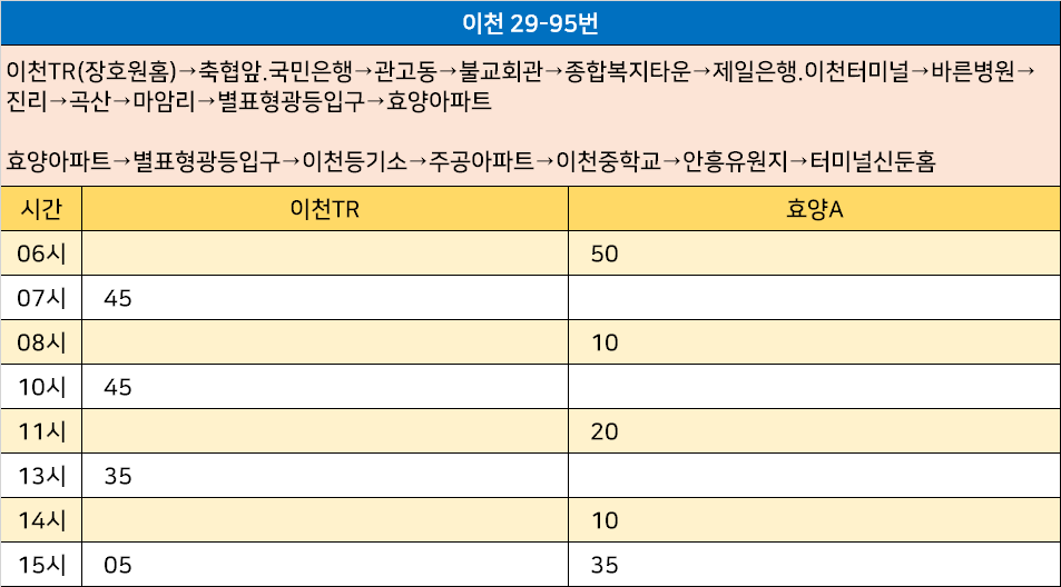이천 29-95번: 이천TR(장호원홈)→축협앞.국민은행→관고동→불교회관→종합복지타운→제일은행.이천터미널→바른병원→진리→곡산→마암리→별표형광등입구→효양아파트 / 효양아파트→별표형광등입구→이천등기소→주공아파트→이천중학교→안흥유원지→터미널신둔홈