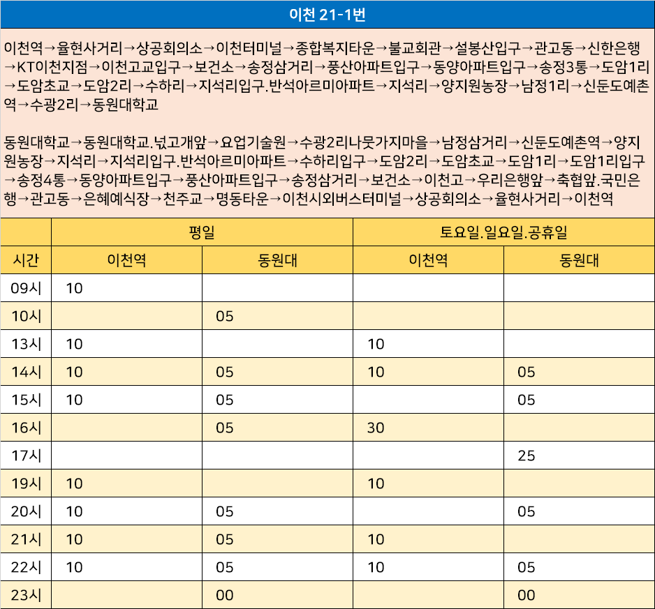 이천 21-1번: 이천역→율현사거리→상공회의소→이천터미널→종합복지타운→불교회관→설봉산입구→관고동→신한은행→KT이천지점→이천고교입구→보건소→송정삼거리→풍산아파트입구→동양아파트입구→송정3통→도암1리→도암초교→도암2리→수하리→지석리입구.반석아르미아파트→지석리→양지원농장→남정1리→신둔도예촌역→수광2리→동원대학교 / 동원대학교→동원대학교.넋고개앞→요업기술원→수광2리나뭇가지마을→남정삼거리→신둔도예촌역→양지원농장→지석리→지석리입구.반석아르미아파트→수하리입구→도암2리→도암초교→도암1리→도암1리입구→송정4통→동양아파트입구→풍산아파트입구→송정삼거리→보건소→이천고→우리은행앞→축협앞.국민은행→관고동→은혜예식장→천주교→명동타운→이천시외버스터미널→상공회의소→율현사거리→이천역