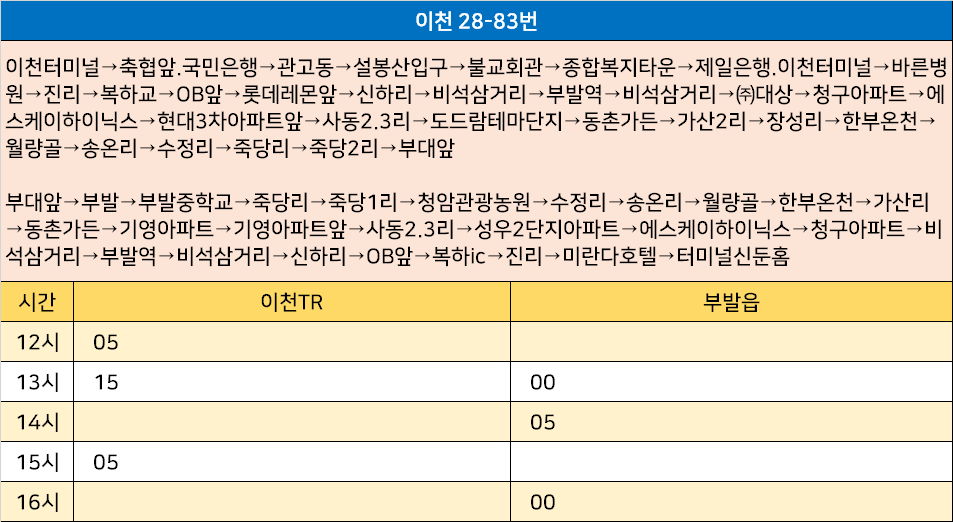 이천 28-83번: 이천터미널→축협앞.국민은행→관고동→설봉산입구→불교회관→종합복지타운→제일은행.이천터미널→바른병원→진리→복하교→OB앞→롯데레몬앞→신하리→비석삼거리→부발역→비석삼거리→㈜대상→청구아파트→에스케이하이닉스→현대3차아파트앞→사동2.3리→도드람테마단지→동촌가든→가산2리→장성리→한부온천→월량골→송온리→수정리→죽당리→죽당2리→부대앞 / 부대앞→부발→부발중학교→죽당리→죽당1리→청암관광농원→수정리→송온리→월량골→한부온천→가산리→동촌가든→기영아파트→기영아파트앞→사동2.3리→성우2단지아파트→에스케이하이닉스→청구아파트→비석삼거리→부발역→비석삼거리→신하리→OB앞→복하ic→진리→미란다호텔→터미널신둔홈