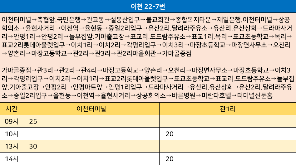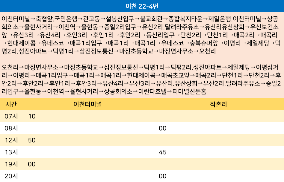이천 22-4번: 이천터미널→축협앞.국민은행→관고동→설봉산입구→불교회관→종합복지타운→제일은행.이천터미널→상공회의소→율현사거리→이천역→율현동→증일2리입구→유산2리.달려라주유소→유산리유산상회→유산보건소앞→유산3리→유산4리→후안3리→후안1리→후안2리→동산리입구→단천2리→단천1리→매곡2리→매곡리→현대제이콤→유네스코→매곡1리입구→매곡1리→매곡1리→유네스코→충북슈퍼앞→이평리→제일제당→덕평2리.성진아파트→덕평1리→삼진정보통신→마장초등학교→마장면사무소→오천리 / 오천리→마장면사무소→마장초등학교→삼진정보통신→덕평1리→덕평2리.성진아파트→제일제당→이평삼거리→이평리→매곡1리입구→매곡1리→매곡1리→현대제이콤→매곡초교앞→매곡2리→단천1리→단천2리→후안2리→후안2리→후안1리→후안3리→유산4리→유산3리→유산리.유산상회→유산2리.달려라주유소→증일2리입구→율현동→이천역→율현사거리→상공회의소→미란다호텔→터미널신둔홈