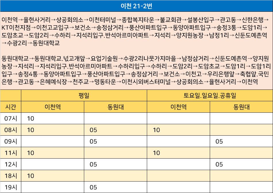 이천 21-2번: 이천역→율현사거리→상공회의소→이천터미널→종합복지타운→불교회관→설봉산입구→관고동→신한은행→KT이천지점→이천고교입구→보건소→송정삼거리→풍산아파트입구→동양아파트입구→송정3통→도암1리→도암초교→도암2리→수하리→지석리입구.반석아르미아파트→지석리→양지원농장→남정1리→신둔도예촌역→수광2리→동원대학교 / 동원대학교→동원대학교.넋고개앞→요업기술원→수광2리나뭇가지마을→남정삼거리→신둔도예촌역→양지원농장→지석리→지석리입구.반석아르미아파트→수하리입구→수하리→도암2리→도암초교→도암1리→도암1리입구→송정4통→동양아파트입구→풍산아파트입구→송정삼거리→보건소→이천고→우리은행앞→축협앞.국민은행→관고동→은혜예식장→천주교→명동타운→이천시외버스터미널→상공회의소→율현사거리→이천역