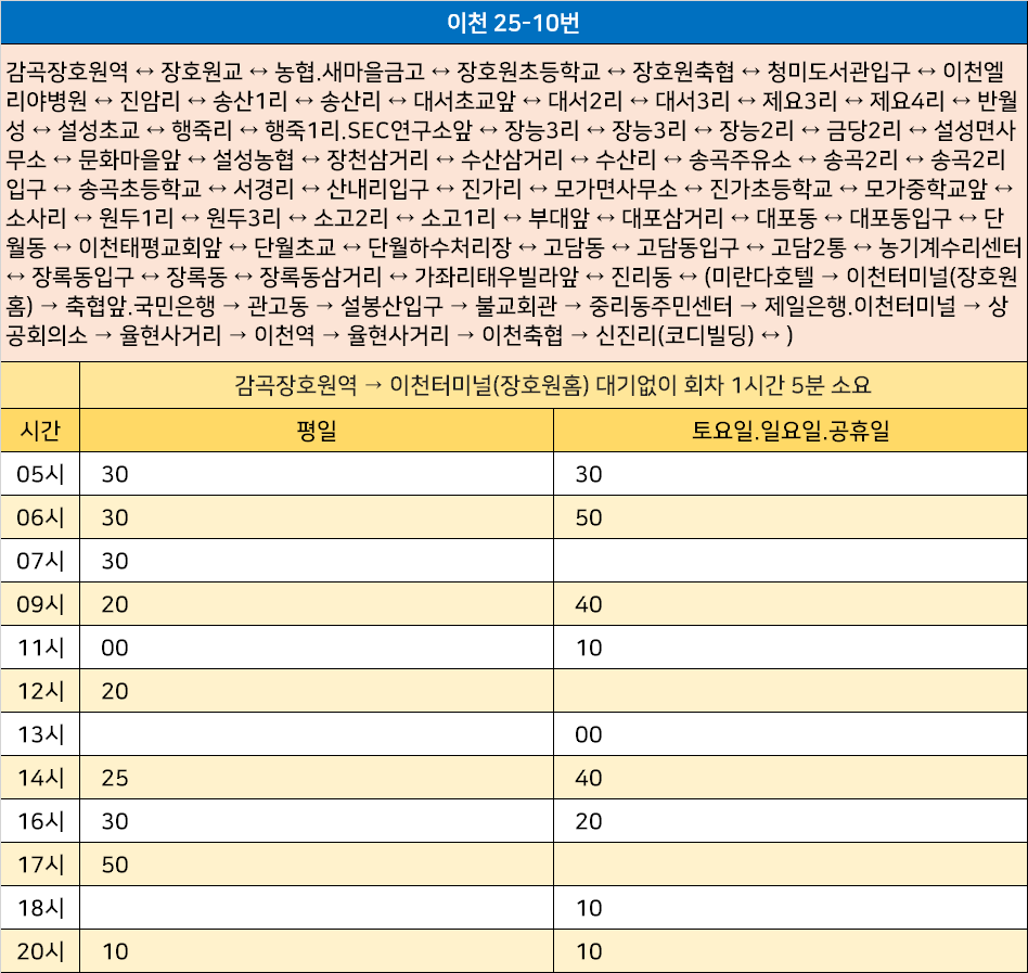 이천 25-10번: 감곡장호원역 ↔ 장호원교 ↔ 농협.새마을금고 ↔ 장호원초등학교 ↔ 장호원축협 ↔ 청미도서관입구 ↔ 이천엘리야병원 ↔ 진암리 ↔ 송산1리 ↔ 송산리 ↔ 대서초교앞 ↔ 대서2리 ↔ 대서3리 ↔ 제요3리 ↔ 제요4리 ↔ 반월성 ↔ 설성초교 ↔ 행죽리 ↔ 행죽1리.SEC연구소앞 ↔ 장능3리 ↔ 장능3리 ↔ 장능2리 ↔ 금당2리 ↔ 설성면사무소 ↔ 문화마을앞 ↔ 설성농협 ↔ 장천삼거리 ↔ 수산삼거리 ↔ 수산리 ↔ 송곡주유소 ↔ 송곡2리 ↔ 송곡2리입구 ↔ 송곡초등학교 ↔ 서경리 ↔ 산내리입구 ↔ 진가리 ↔ 모가면사무소 ↔ 진가초등학교 ↔ 모가중학교앞 ↔ 소사리 ↔ 원두1리 ↔ 원두3리 ↔ 소고2리 ↔ 소고1리 ↔ 부대앞 ↔ 대포삼거리 ↔ 대포동 ↔ 대포동입구 ↔ 단월동 ↔ 이천태평교회앞 ↔ 단월초교 ↔ 단월하수처리장 ↔ 고담동 ↔ 고담동입구 ↔ 고담2통 ↔ 농기계수리센터 ↔ 장록동입구 ↔ 장록동 ↔ 장록동삼거리 ↔ 가좌리태우빌라앞 ↔ 진리동 ↔ (미란다호텔 → 이천터미널(장호원홈) → 축협앞.국민은행 → 관고동 → 설봉산입구 → 불교회관 → 중리동주민센터 → 제일은행.이천터미널 → 상공회의소 → 율현사거리 → 이천역 → 율현사거리 → 이천축협 → 신진리(코디빌딩) ↔ )