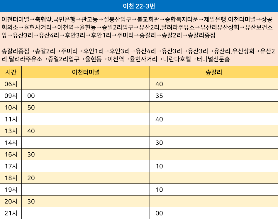 이천 22-3번: 이천터미널→축협앞.국민은행→관고동→설봉산입구→불교회관→종합복지타운→제일은행.이천터미널→상공회의소→율현사거리→이천역→율현동→증일2리입구→유산2리.달려라주유소→유산리유산상회→유산보건소앞→유산3리→유산4리→후안3리→후안1리→주미리→송갈리→송갈2리→송갈리종점 / 송갈리종점→송갈2리→주미리→후안1리→후안3리→유산4리→유산3리→유산3리→유산리.유산상회→유산2리.달려라주유소→증일2리입구→율현동→이천역→율현사거리→미란다호텔→터미널신둔홈