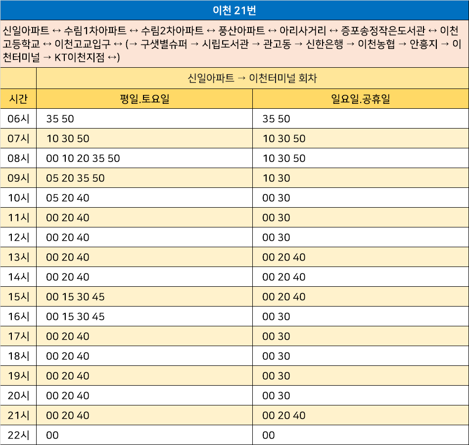 이천 21번: 신일아파트 ↔ 수림1차아파트 ↔ 수림2차아파트 ↔ 풍산아파트 ↔ 아리사거리 ↔ 증포송정작은도서관 ↔ 이천고등학교 ↔ 이천고교입구 ↔ (→ 구샛별슈퍼 → 시립도서관 → 관고동 → 신한은행 → 이천농협 → 안흥지 → 이천터미널 → KT이천지점 ↔)