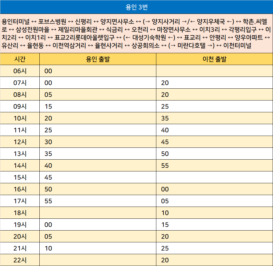 용인 3번: 용인터미널 ↔ 포브스병원 ↔ 신평리 ↔ 양지면사무소 ↔ (→ 양지사거리 →/← 양지우체국 ←) ↔ 학촌.씨엘로 ↔ 삼성전원마을 ↔ 제일리마을회관 ↔ 식금리 ↔ 오천리 ↔ 마장면사무소 ↔ 이치3리 ↔ 각평리입구 ↔ 이치2리 ↔ 이치1리 ↔ 표교2리롯데아울렛입구 ↔ (← 대성기숙학원 ←) ↔ 표교리 ↔ 안평리 ↔ 양우아파트 ↔ 유산리 ↔ 율현동 ↔ 이천역삼거리 ↔ 율현사거리 ↔ 상공회의소 ↔ (→ 미란다호텔 →) ↔ 이천터미널