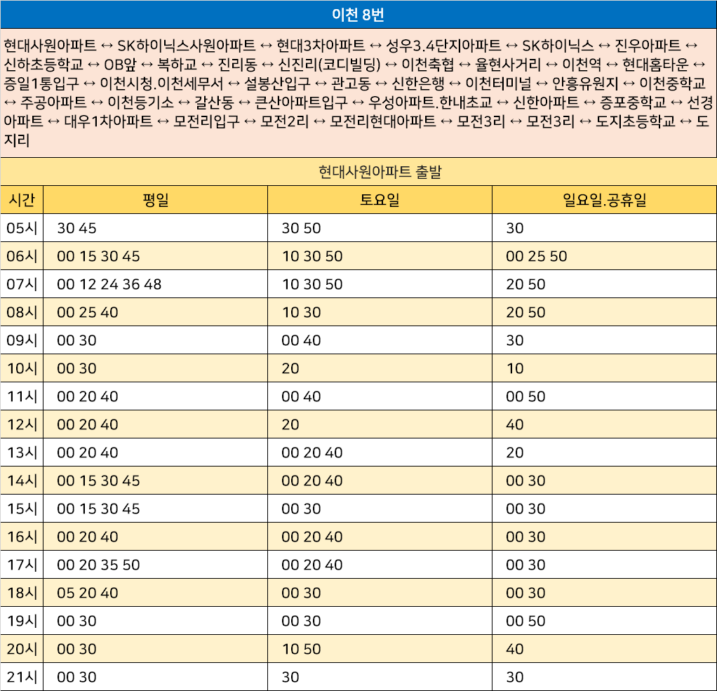 이천 8번: 현대사원아파트 ↔ SK하이닉스사원아파트 ↔ 현대3차아파트 ↔ 성우3.4단지아파트 ↔ SK하이닉스 ↔ 진우아파트 ↔ 신하초등학교 ↔ OB앞 ↔ 복하교 ↔ 진리동 ↔ 신진리(코디빌딩) ↔ 이천축협 ↔ 율현사거리 ↔ 이천역 ↔ 현대홈타운 ↔ 증일1통입구 ↔ 이천시청.이천세무서 ↔ 설봉산입구 ↔ 관고동 ↔ 신한은행 ↔ 이천터미널 ↔ 안흥유원지 ↔ 이천중학교 ↔ 주공아파트 ↔ 이천등기소 ↔ 갈산동 ↔ 큰산아파트입구 ↔ 우성아파트.한내초교 ↔ 신한아파트 ↔ 증포중학교 ↔ 선경아파트 ↔ 대우1차아파트 ↔ 모전리입구 ↔ 모전2리 ↔ 모전리현대아파트 ↔ 모전3리 ↔ 모전3리 ↔ 도지초등학교 ↔ 도지리