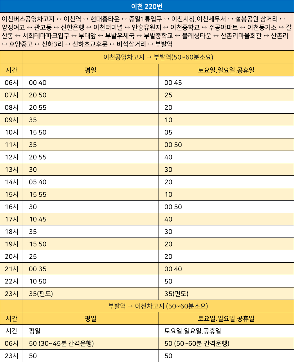 이천 220번: 이천버스공영차고지 ↔ 이천역 ↔ 현대홈타운 ↔ 증일1통입구 ↔ 이천시청.이천세무서 ↔ 설봉공원 삼거리 ↔ 양정여고 ↔ 관고동 ↔ 신한은행 ↔ 이천터미널 ↔ 안흥유원지 ↔ 이천중학교 ↔ 주공아파트 ↔ 이천등기소 ↔ 갈산동 ↔ 서희테마파크입구 ↔ 부대앞 ↔ 부발우체국 ↔ 부발중학교 ↔ 블레싱타운 ↔ 산촌리마을회관 ↔ 산촌리 ↔ 효양중고 ↔ 신하3리 ↔ 신하초교후문 ↔ 비석삼거리 ↔ 부발역