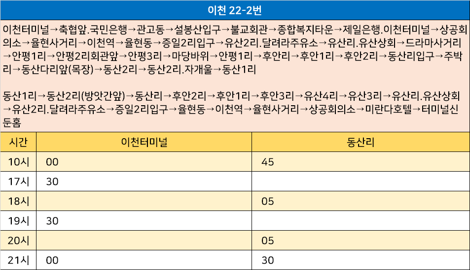 이천 22-2번: 이천터미널→축협앞.국민은행→관고동→설봉산입구→불교회관→종합복지타운→제일은행.이천터미널→상공회의소→율현사거리→이천역→율현동→증일2리입구→유산2리.달려라주유소→유산리.유산상회→드라마사거리→안평1리→안평2리회관앞→안평3리→마당바위→안평1리→후안리→후안1리→후안2리→동산리입구→주박리→동산다리앞(목장)→동산2리→동산2리.자개울→동산1리 / 동산1리→동산2리(방앗간앞)→동산리→후안2리→후안1리→후안3리→유산4리→유산3리→유산리.유산상회→유산2리.달려라주유소→증일2리입구→율현동→이천역→율현사거리→상공회의소→미란다호텔→터미널신둔홈