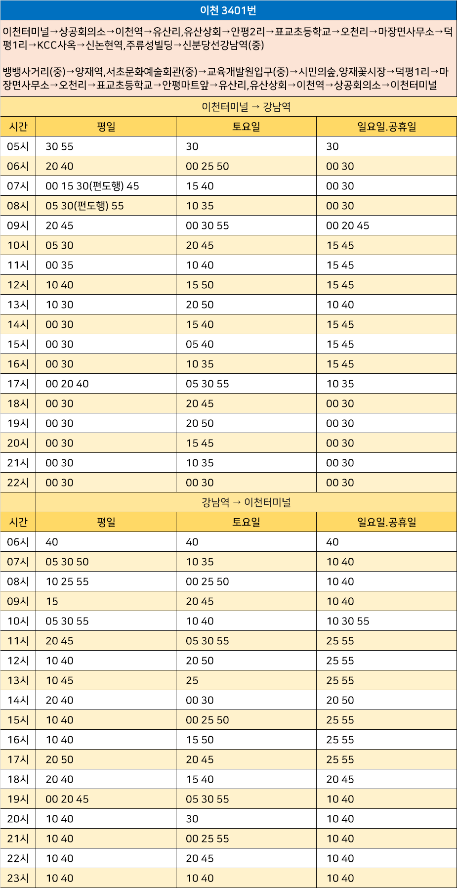 이천 3401번: 이천터미널→상공회의소→이천역→유산리,유산상회→안평2리→표교초등학교→오천리→마장면사무소→덕평1리→KCC사옥→신논현역,주류성빌딩→신분당선강남역(중) / 뱅뱅사거리(중)→양재역,서초문화예술회관(중)→교육개발원입구(중)→시민의숲,양재꽃시장→덕평1리→마장면사무소→오천리→표교초등학교→안평마트앞→유산리,유산상회→이천역→상공회의소→이천터미널