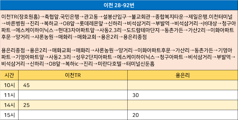 이천 28-92번: 이천TR(장호원홈)→축협앞.국민은행→관고동→설봉산입구→불교회관→종합복지타운→제일은행.이천터미널→바른병원→진리→복하교→OB앞→롯데레몬앞→신하리→비석삼거리→부발역→비석삼거리→㈜대상→청구아파트→에스케이하이닉스→현대3차아파트앞→사동2.3리→도드람테마단지→동촌가든→가산2리→이화아파트후문→양거리→샤론농원→매화리→매화교회→용은2리→용은리종점 / 용은리종점→용은2리→매화교회→매화리→샤론농원→양거리→이화아파트후문→가산리→동촌가든→기영아파트→기영아파트앞→사동2.3리→성우2단지아파트→에스케이하이닉스→청구아파트→비석삼거리→부발역→비석삼거리→신하리→OB앞→복하ic→진리→미란다호텔→터미널신둔홈