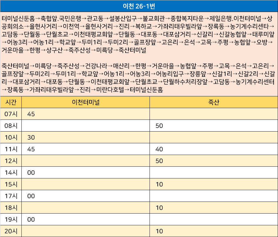 이천 26-1번: 터미널신둔홈→축협앞.국민은행→관고동→설봉산입구→불교회관→종합복지타운→제일은행.이천터미널→상공회의소→율현사거리→이천역→율현사거리→진리→복하교→가좌리태우빌라앞→장록동→농기계수리센타→고담동→단월동→단월초교→이천태평교회앞→단월동→대포동→대포삼거리→신갈리→신갈농협앞→태루미앞→어농3리→어농1리→학교앞→두미1리→두미2리→골프장앞→고은리→은석→고목→주평→농협앞→오방→거운마을→한평→상구산→죽주산성→미륵당→죽산터미널 / 죽산터미널→미륵당→죽주산성→건강나라→매산리→한평→거운마을→농협앞→주평→고목→은석→고은리→골프장앞→두미2리→두미1리→학교앞→어농1리→어농3리→어농리입구→장릉앞→신갈1리→신갈2리→신갈리→대포삼거리→대포동→단월동→이천태평교회앞→단월초교→단월하수처리장앞→고담동→농기계수리센터→장록동→가좌리태우빌라앞→진리→미란다호텔→터미널신둔홈