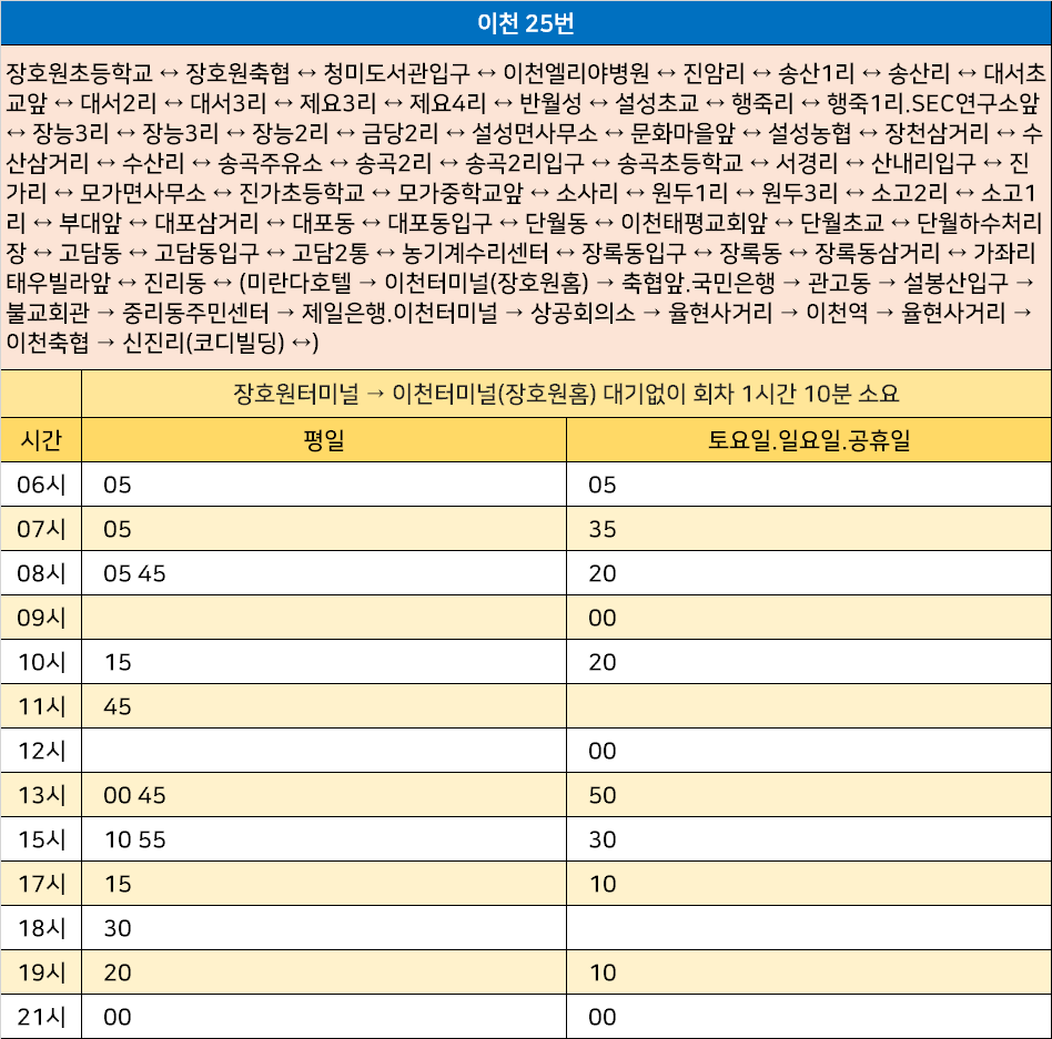 이천 25번: 장호원초등학교 ↔ 장호원축협 ↔ 청미도서관입구 ↔ 이천엘리야병원 ↔ 진암리 ↔ 송산1리 ↔ 송산리 ↔ 대서초교앞 ↔ 대서2리 ↔ 대서3리 ↔ 제요3리 ↔ 제요4리 ↔ 반월성 ↔ 설성초교 ↔ 행죽리 ↔ 행죽1리.SEC연구소앞 ↔ 장능3리 ↔ 장능3리 ↔ 장능2리 ↔ 금당2리 ↔ 설성면사무소 ↔ 문화마을앞 ↔ 설성농협 ↔ 장천삼거리 ↔ 수산삼거리 ↔ 수산리 ↔ 송곡주유소 ↔ 송곡2리 ↔ 송곡2리입구 ↔ 송곡초등학교 ↔ 서경리 ↔ 산내리입구 ↔ 진가리 ↔ 모가면사무소 ↔ 진가초등학교 ↔ 모가중학교앞 ↔ 소사리 ↔ 원두1리 ↔ 원두3리 ↔ 소고2리 ↔ 소고1리 ↔ 부대앞 ↔ 대포삼거리 ↔ 대포동 ↔ 대포동입구 ↔ 단월동 ↔ 이천태평교회앞 ↔ 단월초교 ↔ 단월하수처리장 ↔ 고담동 ↔ 고담동입구 ↔ 고담2통 ↔ 농기계수리센터 ↔ 장록동입구 ↔ 장록동 ↔ 장록동삼거리 ↔ 가좌리태우빌라앞 ↔ 진리동 ↔ (미란다호텔 → 이천터미널(장호원홈) → 축협앞.국민은행 → 관고동 → 설봉산입구 → 불교회관 → 중리동주민센터 → 제일은행.이천터미널 → 상공회의소 → 율현사거리 → 이천역 → 율현사거리 → 이천축협 → 신진리(코디빌딩) ↔)