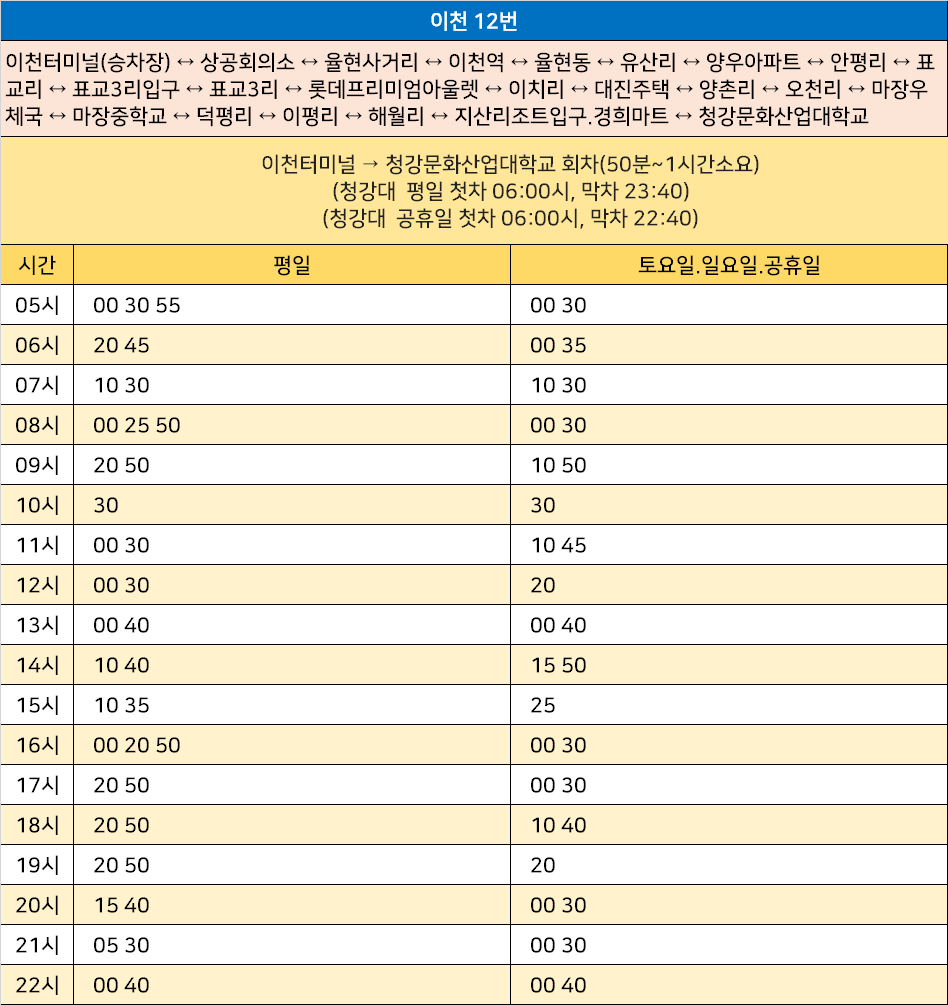 이천 12번: 이천터미널(승차장) ↔ 상공회의소 ↔ 율현사거리 ↔ 이천역 ↔ 율현동 ↔ 유산리 ↔ 양우아파트 ↔ 안평리 ↔ 표교리 ↔ 표교3리입구 ↔ 표교3리 ↔ 롯데프리미엄아울렛 ↔ 이치리 ↔ 대진주택 ↔ 양촌리 ↔ 오천리 ↔ 마장우체국 ↔ 마장중학교 ↔ 덕평리 ↔ 이평리 ↔ 해월리 ↔ 지산리조트입구.경희마트 ↔ 청강문화산업대학교