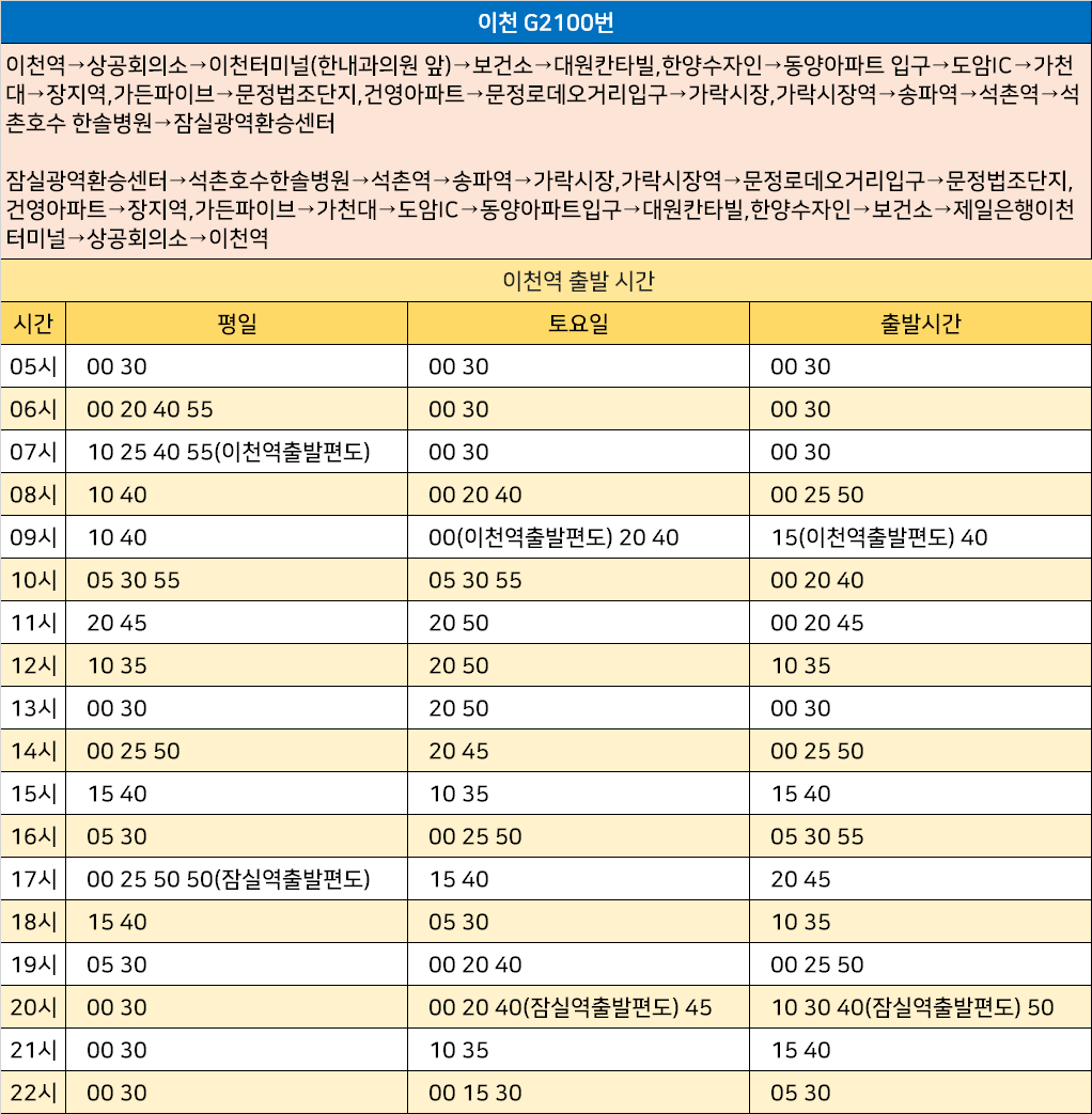 이천 G2100번: 이천역→상공회의소→이천터미널(한내과의원 앞)→보건소→대원칸타빌,한양수자인→동양아파트 입구→도암IC→가천대→장지역,가든파이브→문정법조단지,건영아파트→문정로데오거리입구→가락시장,가락시장역→송파역→석촌역→석촌호수 한솔병원→잠실광역환승센터 / 잠실광역환승센터→석촌호수한솔병원→석촌역→송파역→가락시장,가락시장역→문정로데오거리입구→문정법조단지,건영아파트→장지역,가든파이브→가천대→도암IC→동양아파트입구→대원칸타빌,한양수자인→보건소→제일은행이천터미널→상공회의소→이천역