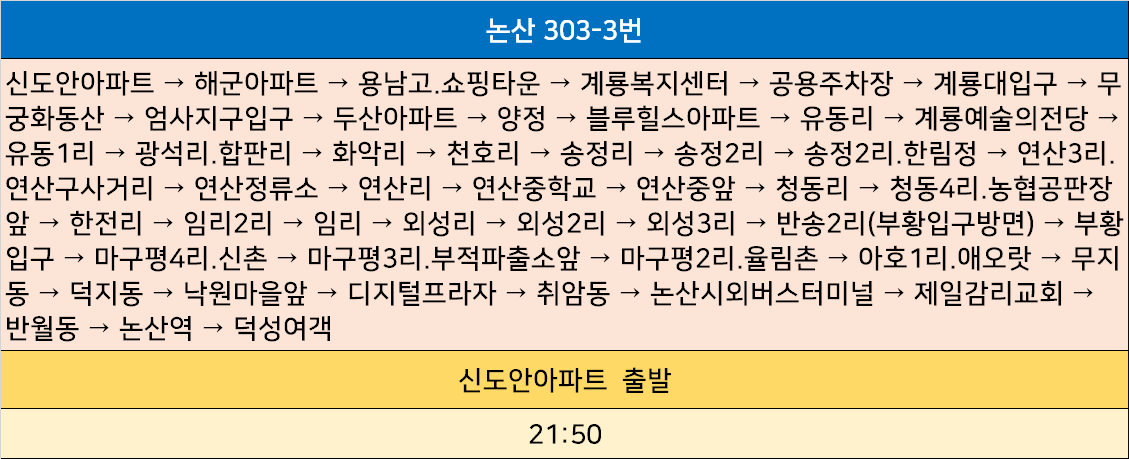 논산 303-1번: 신도안아파트 → 해군아파트 → 용남고.쇼핑타운 → 계룡복지센터 → 공용주차장 → 계룡대입구 → 무궁화동산 → 엄사지구입구 → 두산아파트 → 양정 → 블루힐스아파트 → 유동리 → 계룡예술의전당 → 유동1리 → 광석리.합판리 → 화악리 → 천호리 → 송정리 → 송정2리 → 송정2리.한림정 → 연산3리.연산구사거리 → 연산정류소 → 연산리 → 연산시장 → 연산중학교 → 연산중앞 → 청동리 → 청동4리.농협공판장앞 → 한전리 → 임리2리 → 임리 → 외성리 → 외성2리 → 외성3리 → 반송2리(부황입구방면) → 부황입구 → 마구평4리.신촌 → 마구평3리.부적파출소앞 → 마구평2리.율림촌 → 아호1리.애오랏 → 무지동 → 덕지동 → 낙원마을앞 → 디지털프라자 → 취암동 → 논산시외버스터미널 → 제일감리교회 → 반월동 → 논산역 → 덕성여객