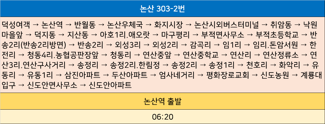 논산 303-2번: 덕성여객 → 논산역 → 반월동 → 논산우체국 → 화지시장 → 논산시외버스터미널 → 취암동 → 낙원마을앞 → 덕지동 → 지산동 → 아호1리.애오랏 → 마구평리 → 부적면사무소 → 부적초등학교 → 반송2리(반송2리방면) → 반송2리 → 외성3리 → 외성2리 → 감곡리 → 임1리 → 임리.돈암서원 → 한전리 → 청동4리.농협공판장앞 → 청동리 → 연산중앞 → 연산중학교 → 연산리 → 연산정류소 → 연산3리.연산구사거리 → 송정리 → 송정2리.한림정 → 송정2리 → 송정1리 → 천호리 → 화악리 → 유동리 → 유동1리 → 삼진아파트 → 두산아파트 → 엄사네거리 → 평화장로교회 → 신도농원 → 계룡대입구 → 신도안면사무소 → 신도안아파트