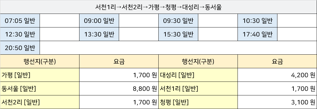 안보리시외고속버스터미널 안보리정류장 안보리정류소→ "서천1리→서천2리→가평→청평→대성리→동서울".