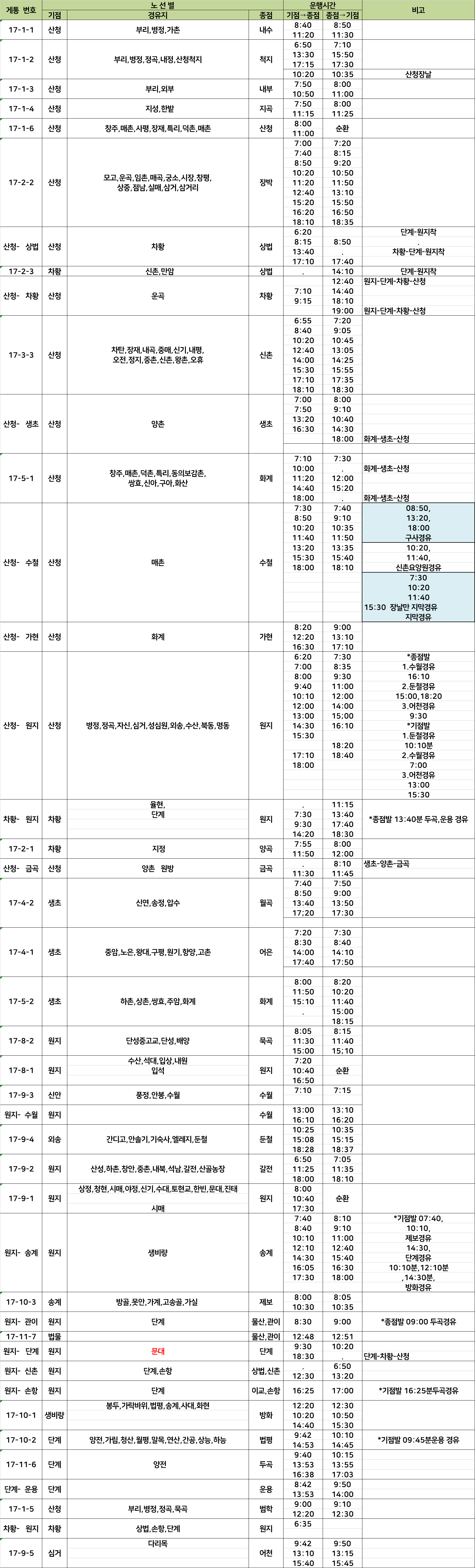 산청 방면 농어촌 버스 시간표 - 산청군청 자료