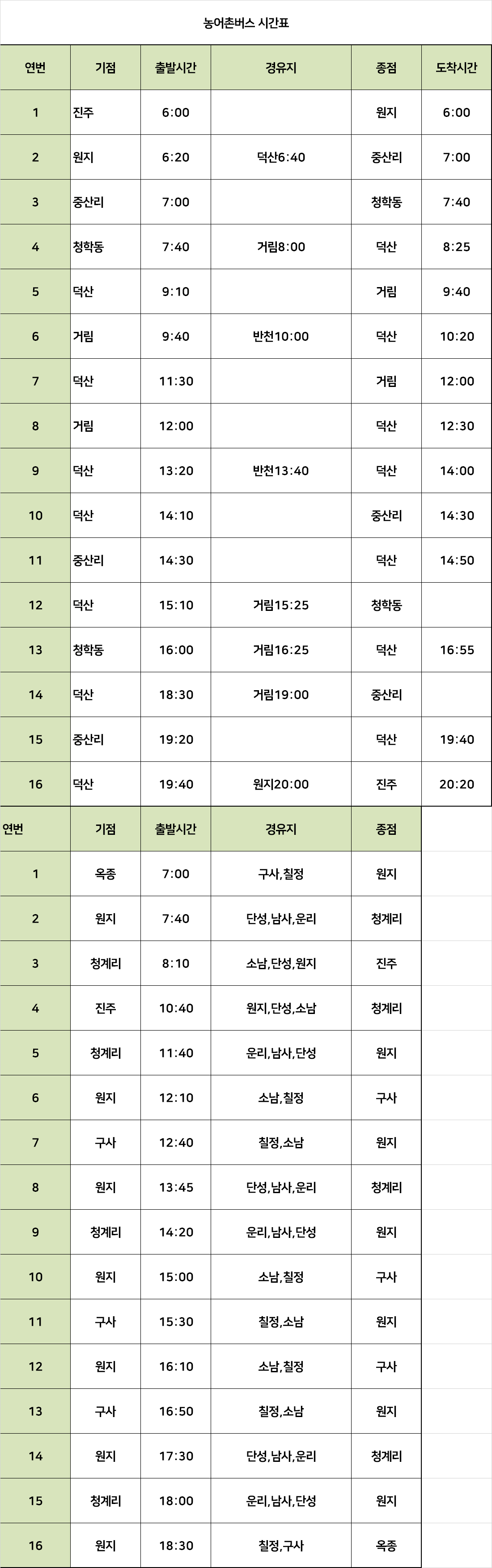 산청 방면 농어촌 버스 시간표 - 산청군청 자료