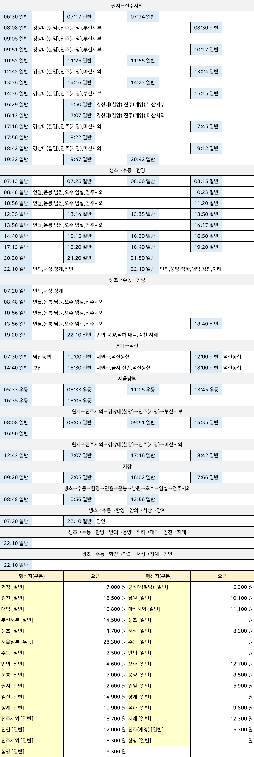 산청 시외버스 터미널 시간표/요금표 2025년 05월 16일 기준