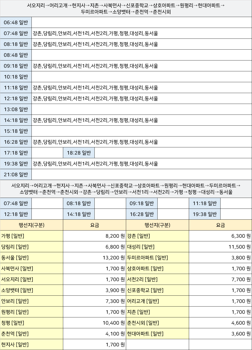 달거리시외고속버스터미널 달거리정류장 달거리정류소 → "서오지리→어리고개→현지사→지촌→사북면사→신포중학교→상호아파트→원평리→현대아파트→두미르아파트→소양뱃터→춘천역→춘천시외→강촌→당림리→안보리→서천1리→서천2리→가평→청평→대성리→동서울".