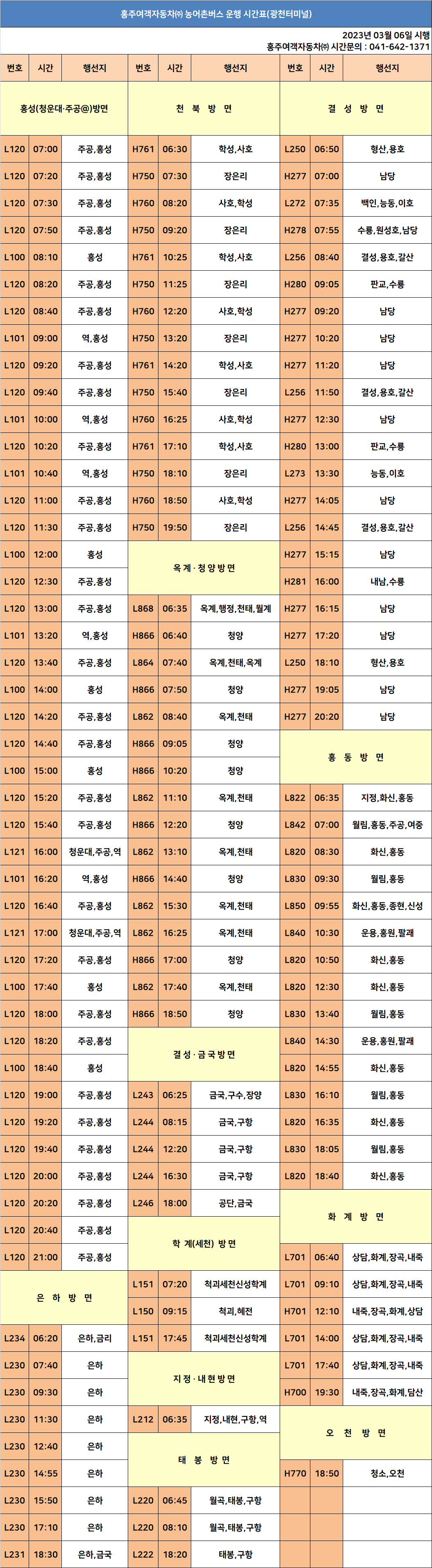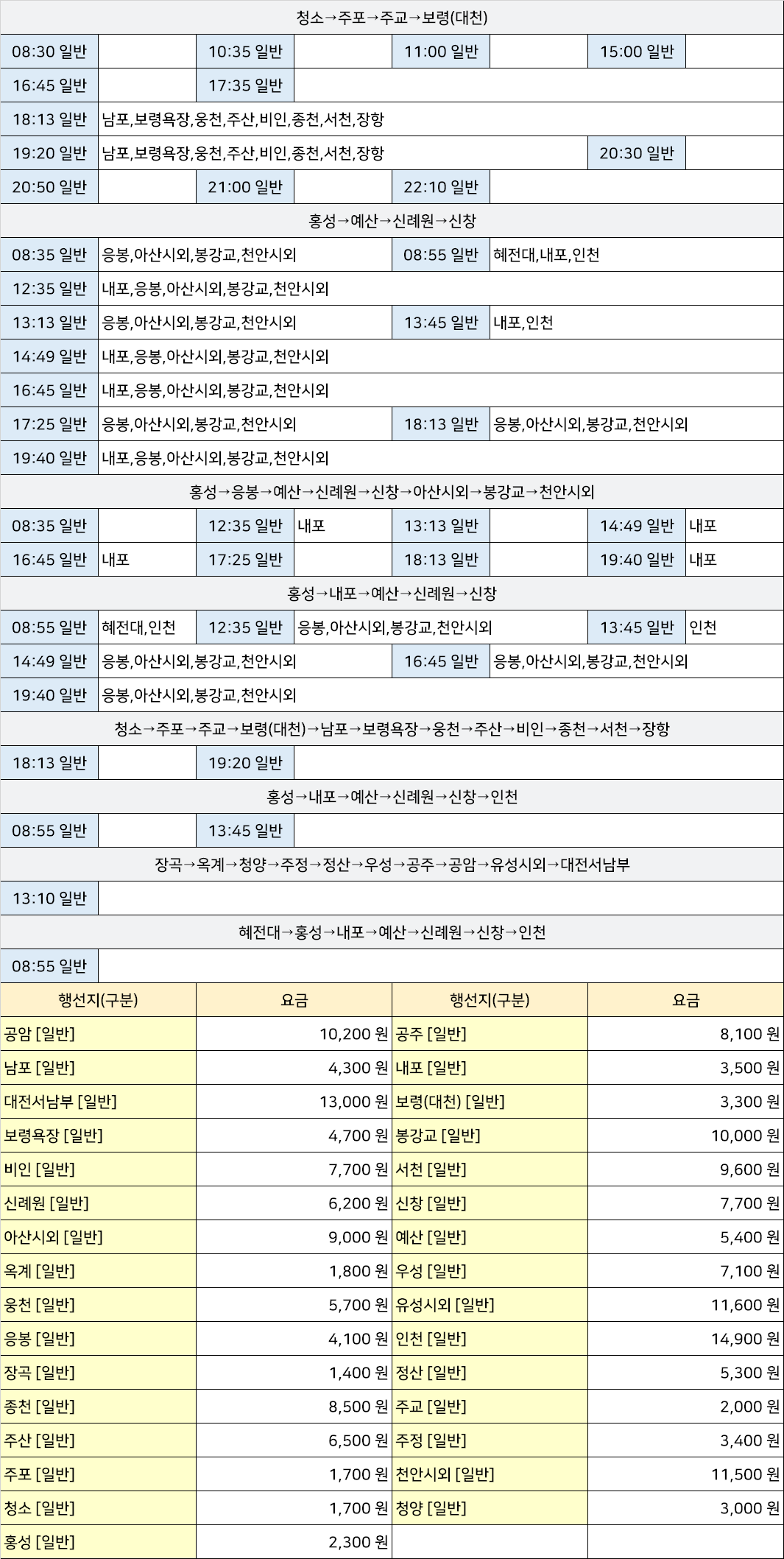 홍성 광천 시외버스 터미널 시간표/요금표 2025년 06월 05일 기준