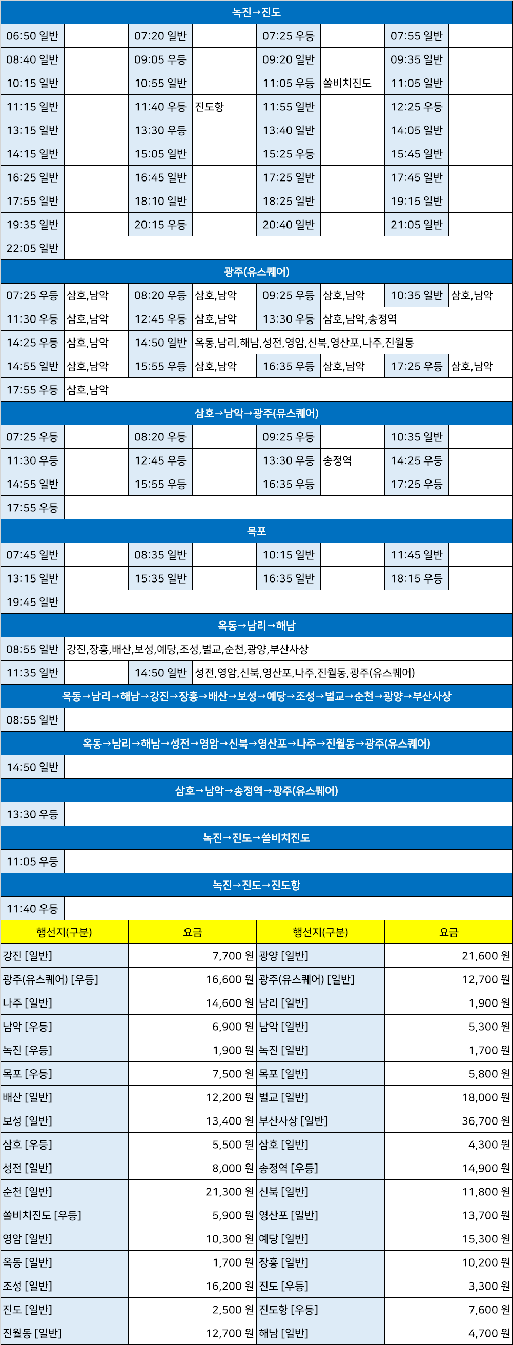 우수영시외고속버스정류장 우수영정류소 우수영터미널 → "녹진→진도→쏠비치진도,녹진→진도→진도항,목포,삼호→남악→광주(유스퀘어),삼호→남악→송정역→광주(유스퀘어),옥동→남리→해남→강진→장흥→배산→보성→예당→조성→벌교→순천→광양→부산사상,옥동→남리→해남→성전→영암→신북→영산포→나주→진월동→광주(유스퀘어)".