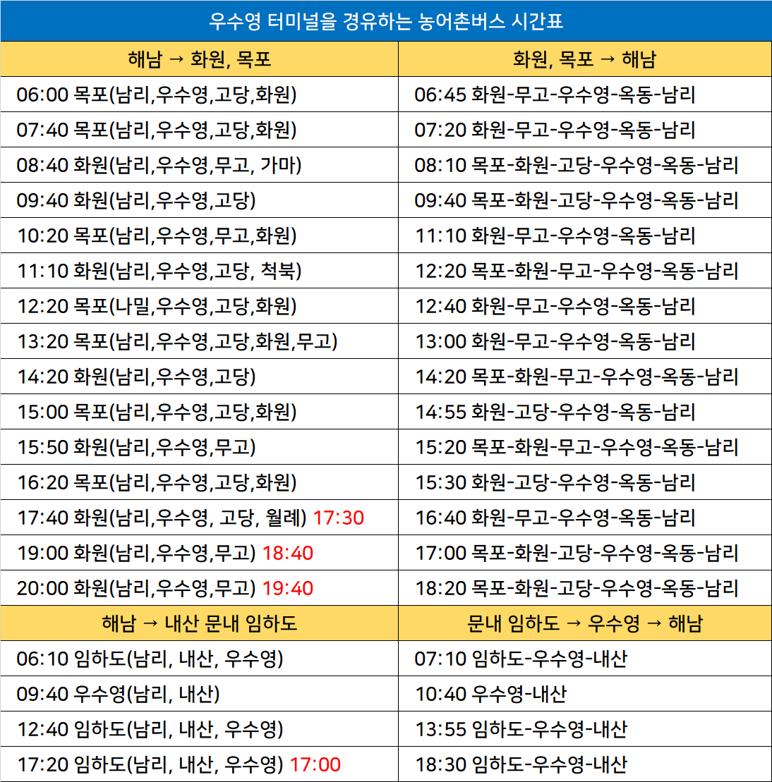 우수영터미널 노선정보: 해남↔화원,목포, 문내임하도↔우수영↔해남, 가마, 고당, 나밀, 남리, 내산, 무고, 옥동, 월례, 임하도, 척북