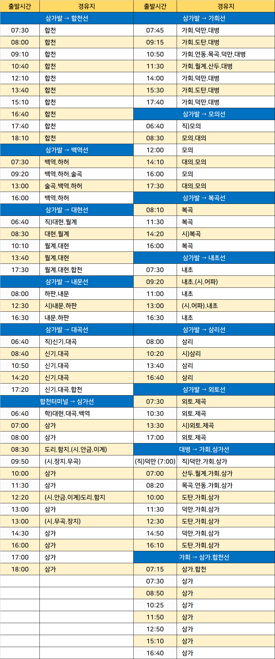 삼가발 → 합천선, 삼가발 → 백역선, 삼가발 → 대현선, 삼가발 → 내문선, 삼가발 → 대곡선, 합천터미널 → 삼가선, 삼가발 → 가회선, 삼가발 → 모의선, 삼가발 → 복곡선, 삼가발 → 내초선, 삼가발 → 삼리선, 삼가발 → 외토선, 대병 → 가회.삼가선, 가회 → 삼가.합천선, 하허, 술곡, 월계, 하판, 신기, 도리, 함지, 안금, 이계, 도탄, 덕만, 제곡, 어파, 대의, 연동
