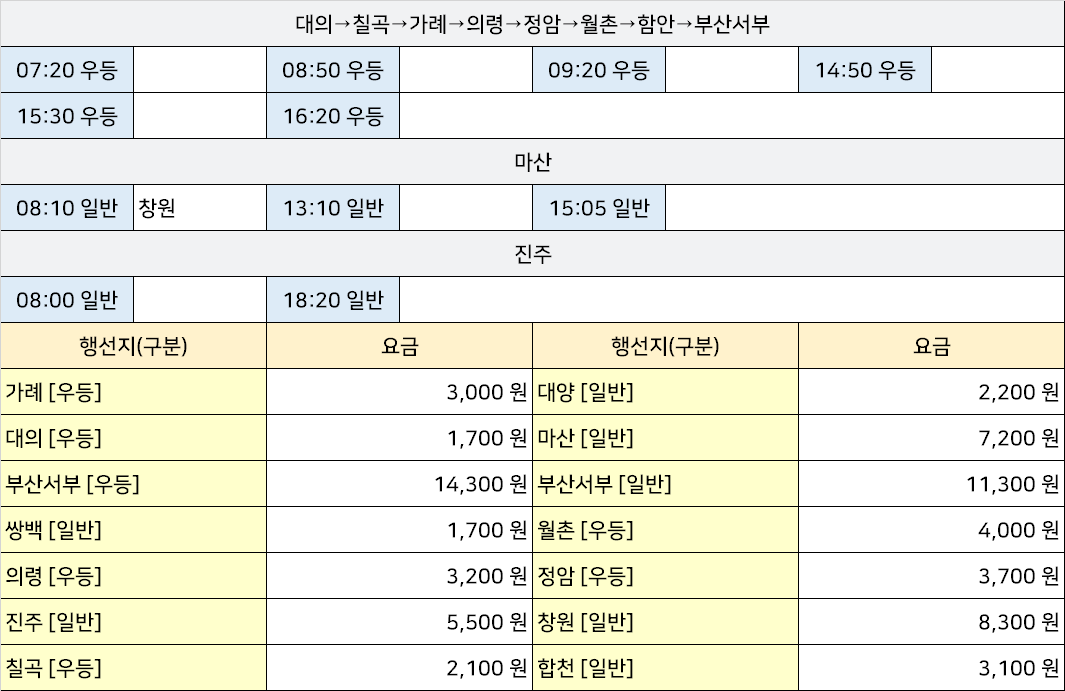 경전여객삼가합동시외고속버스터미널 삼가정류장 삼가정류소 → "대의→칠곡→가례→의령→정암→월촌→함안→부산서부,마산,진주,창원".