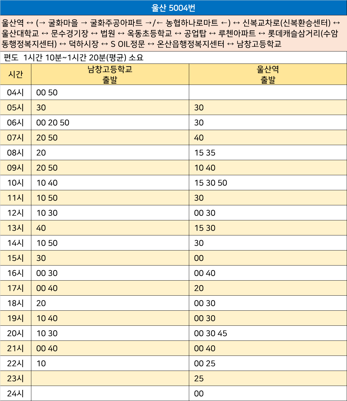 울산 5004번: 울산역 ↔ (→ 굴화마을 → 굴화주공아파트 →/← 농협하나로마트 ←) ↔ 신복교차로(신복환승센터) ↔ 울산대학교 ↔ 문수경기장 ↔ 법원 ↔ 옥동초등학교 ↔ 공업탑 ↔ 루첸아파트 ↔ 롯데캐슬삼거리(수암동행정복지센터) ↔ 덕하시장 ↔ S OIL정문 ↔ 온산읍행정복지센터 ↔ 남창고등학교
